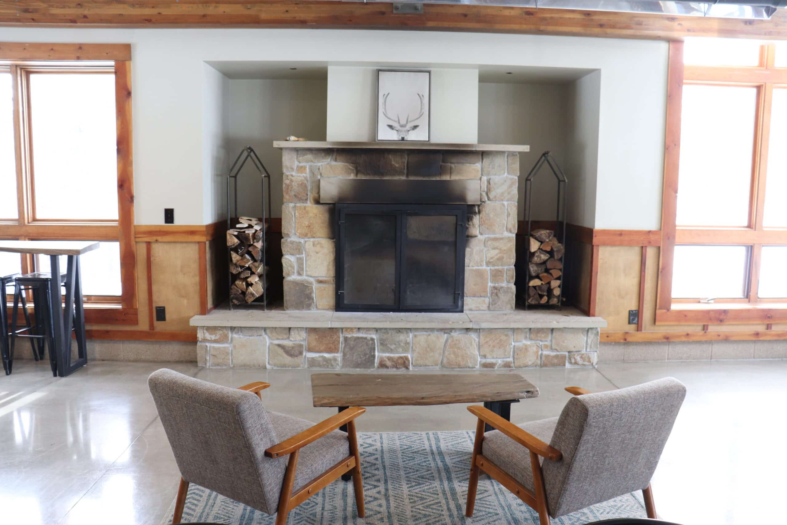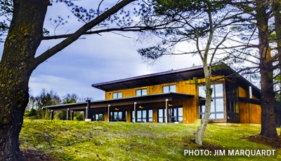 Also, across the way, climbers can test their strength and strategy on a 12-foot-high, 900-square-foot freeform boulder wall (holds in place during warm weather months), and a Nature-based playground for kids includes log balance beams, a canoe sandbox, a log tunnel, a play cabin, boulders and other various climbing elements.