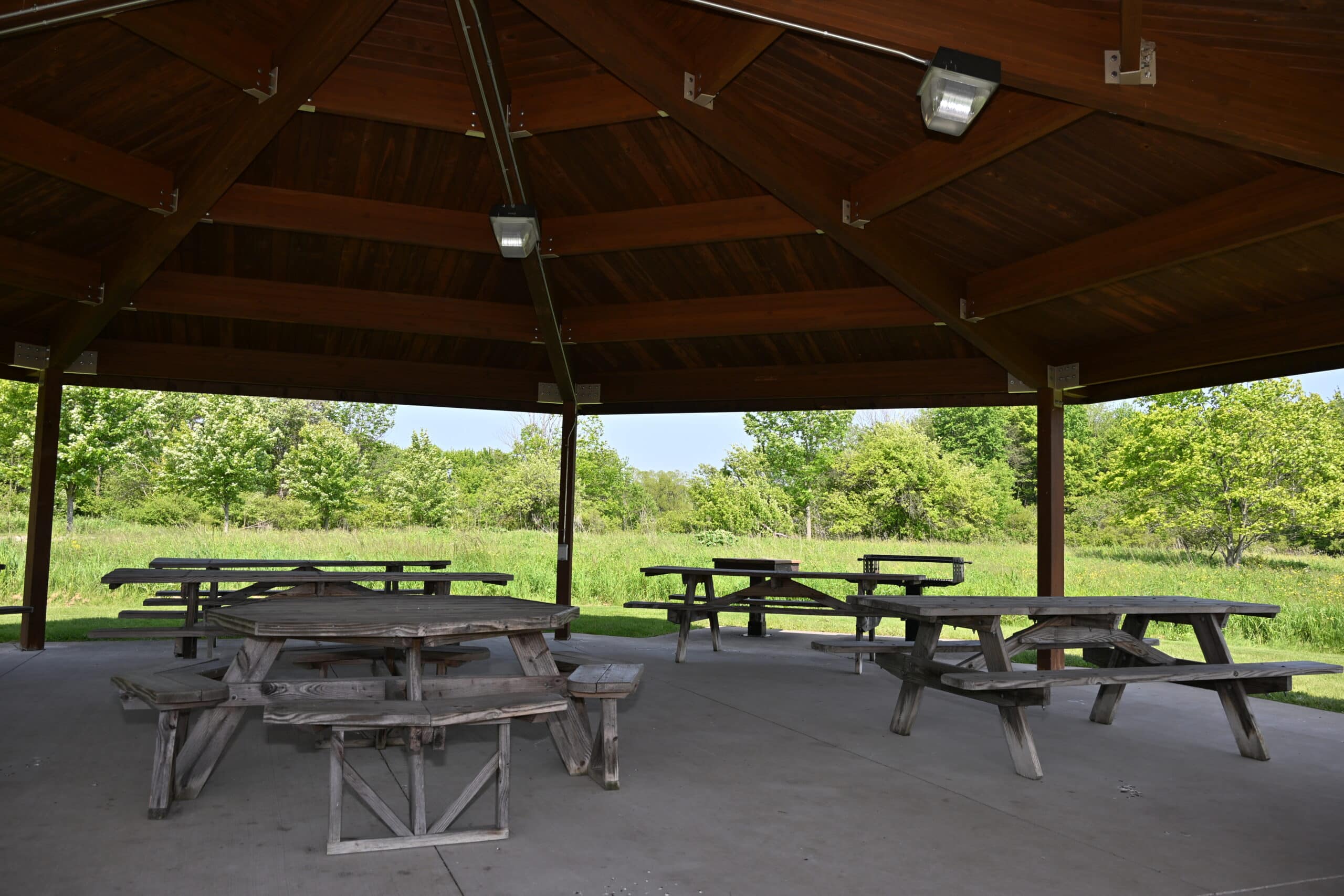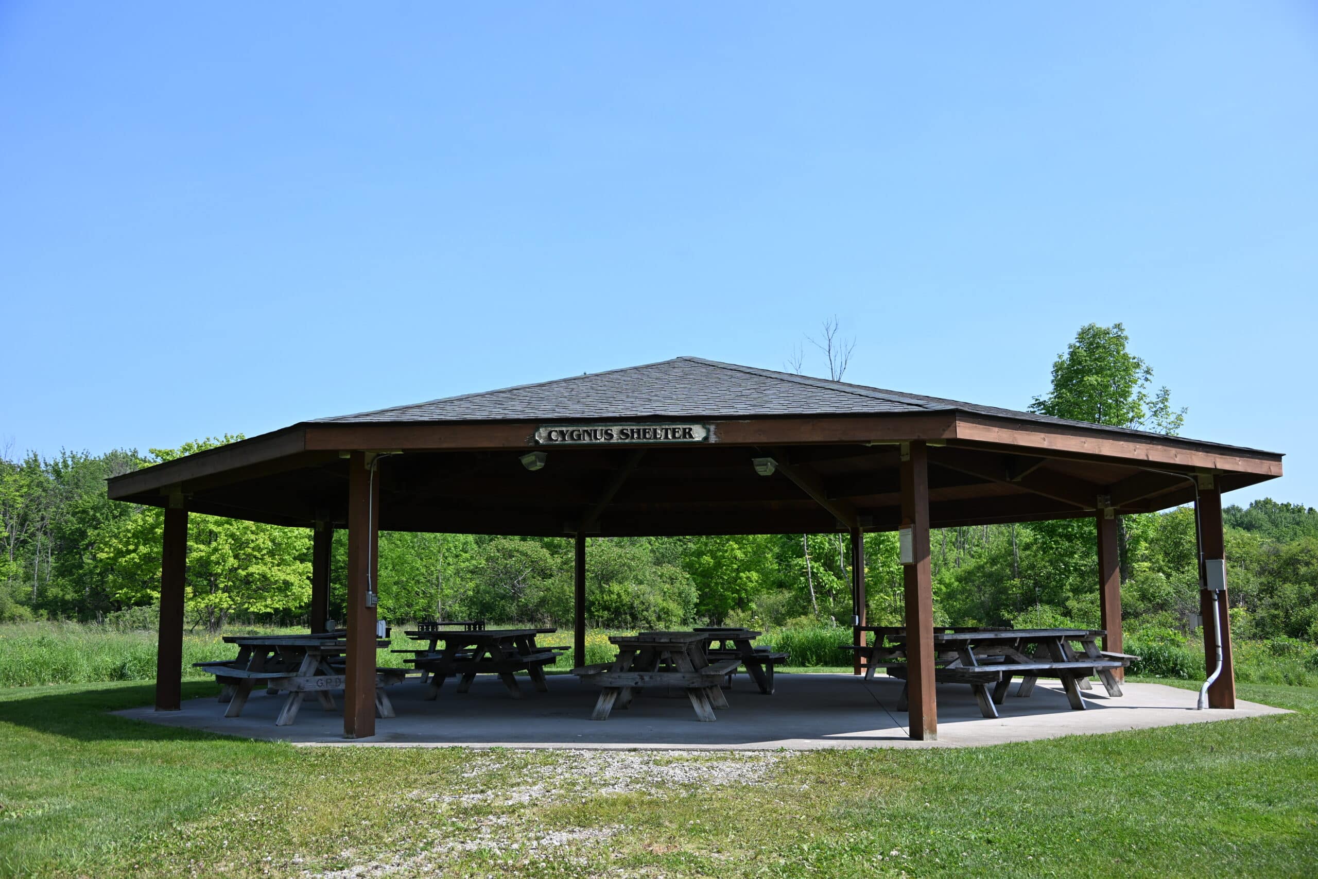 Cygnus Shelter can host up to 75 people and offers 10 picnic tables, electrical outlets and a grill. Vault-style restrooms are located at the nearby Central Plaza.