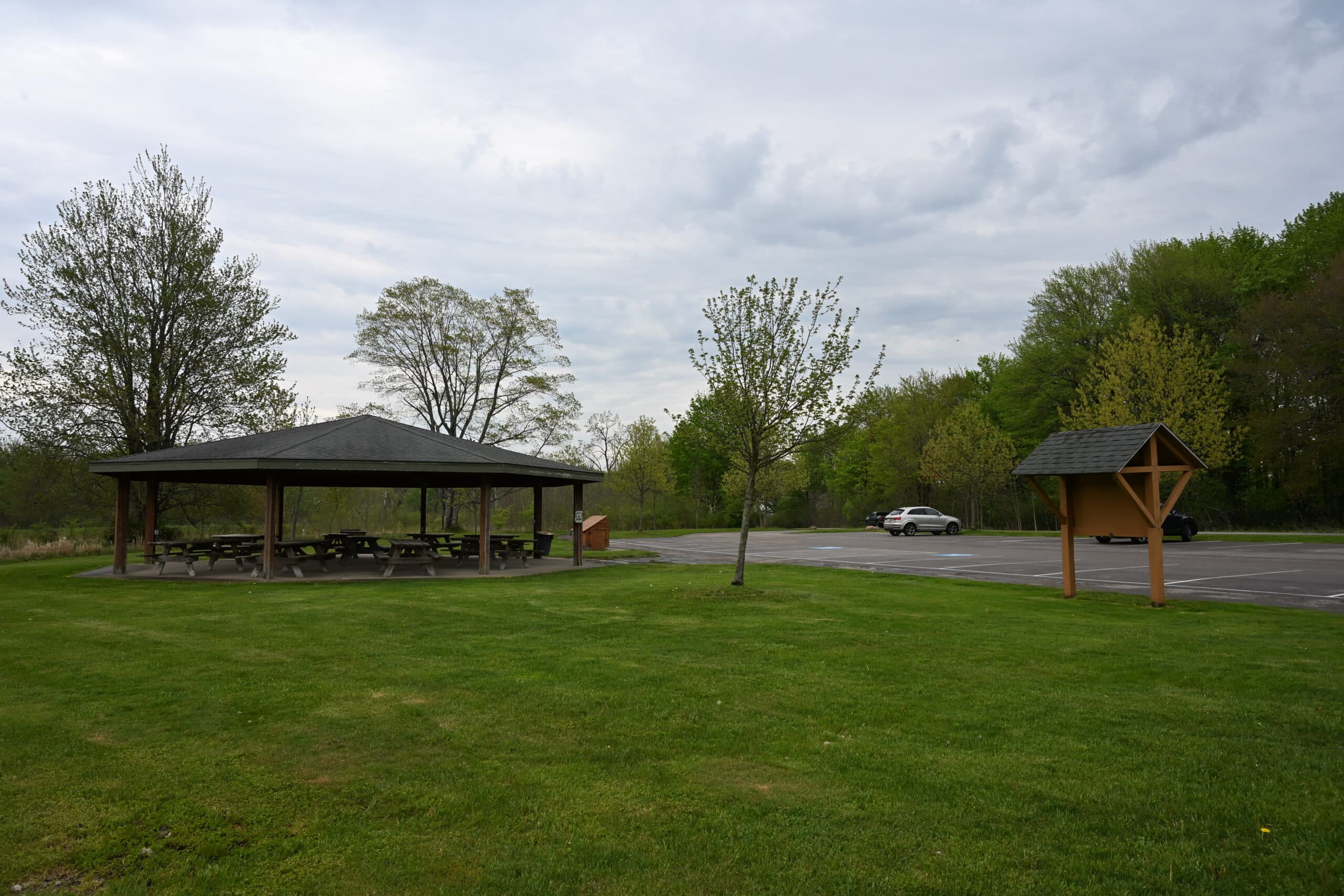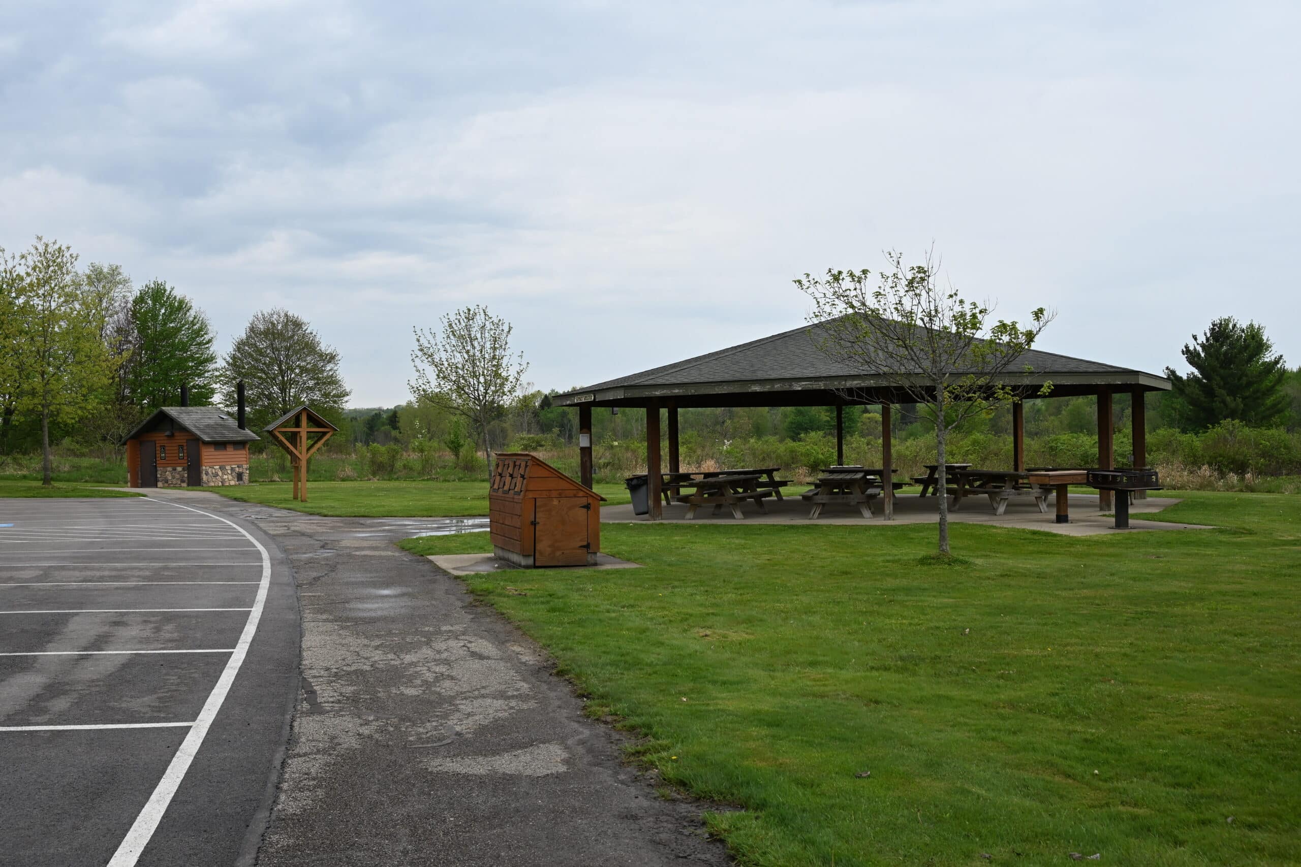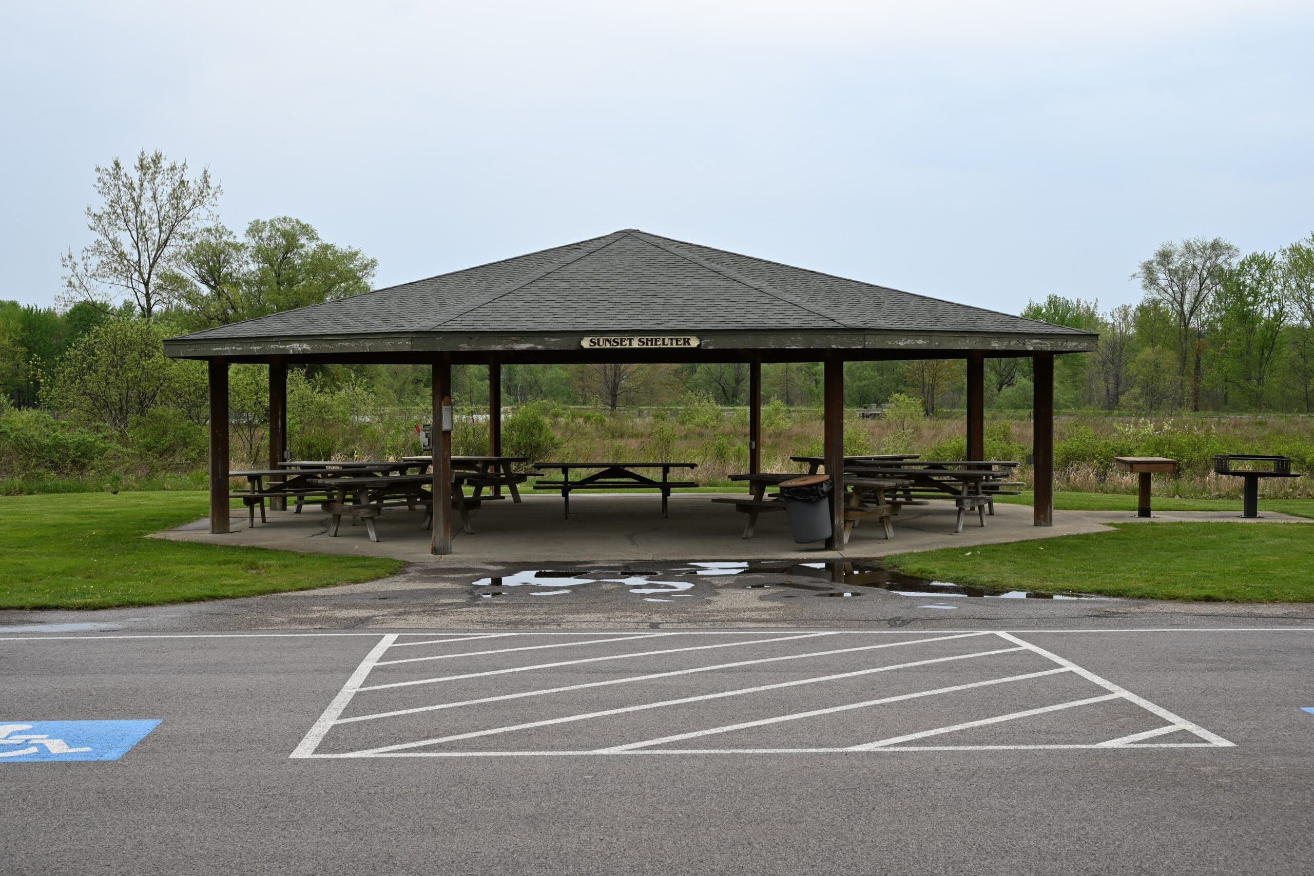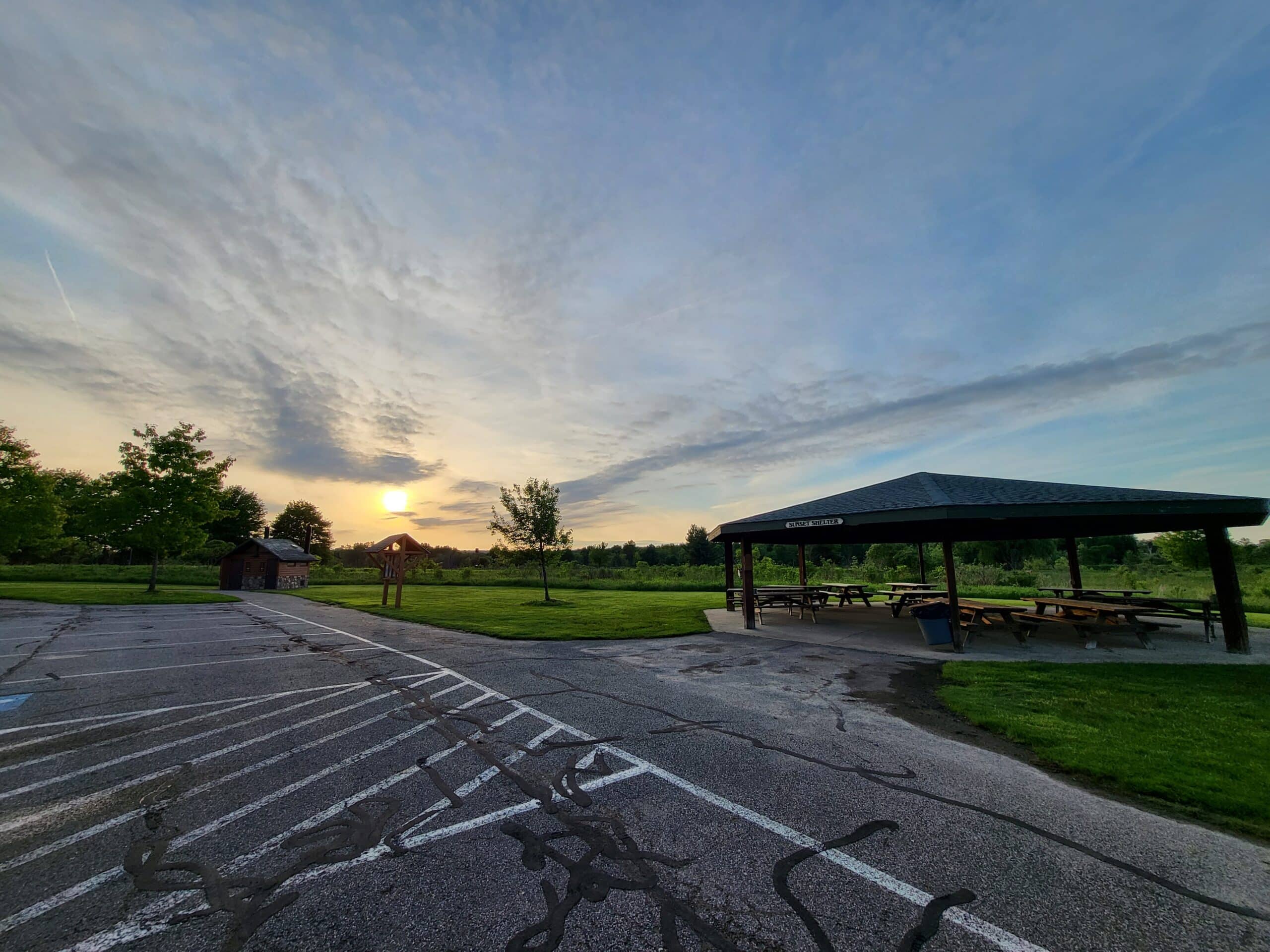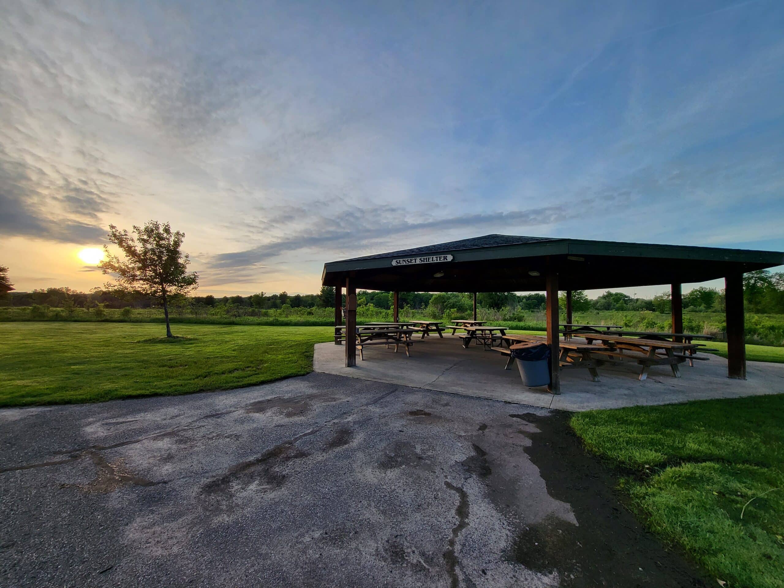 Sunset Shelter can host up to 75 people and offers 9 picnic tables, electrical outlets, a grill, and nearby vault-style restrooms.